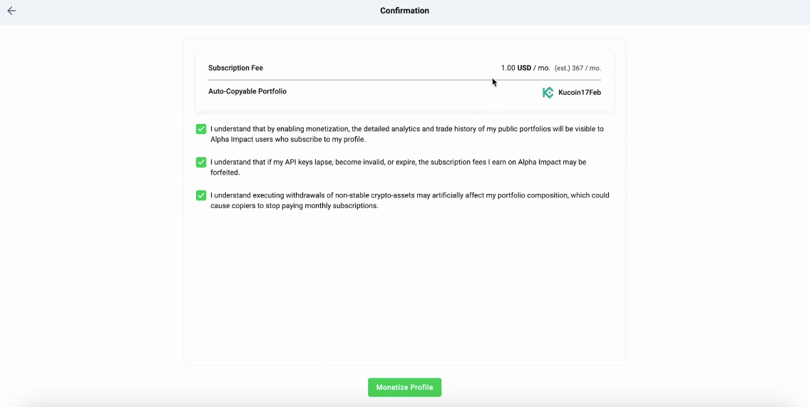 If you’re a trader who wants to set up an auto-copyable portfolio on Alpha Impact, you’ll need to monetize your portfolio first.