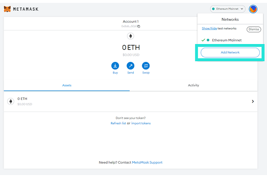 MetaMask only comes with Ethereum mainnet, their default network. To enable MetaMask on the Polygon network, a custom network can be added to MetaMask. The following steps include adding the Polygon network to your MetaMask wallet.