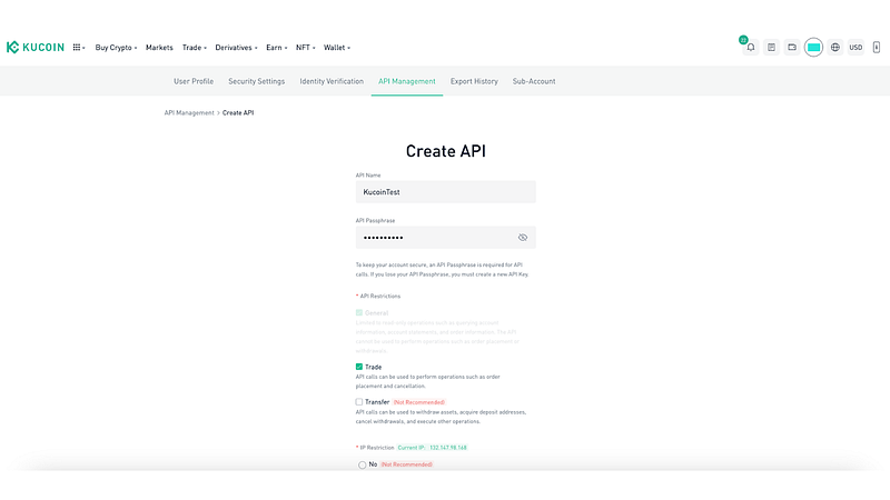 3. On the Kucoin API List, click on “Create API” and name your API Key and API Passphrase