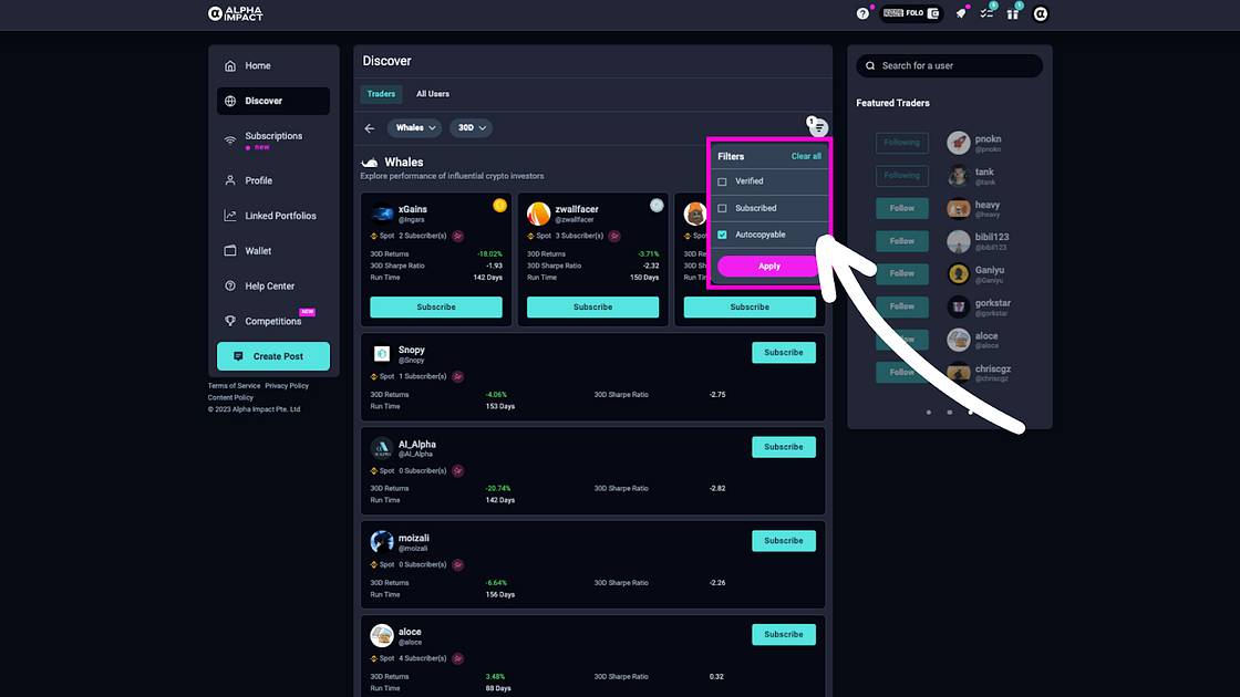 Experience the power of Alpha Impact’s revamped UI/UX on the Discover page, designed to provide you with a comprehensive overview of the diverse trading community and influential thought leaders in one glance or delve deeper into their strategies.