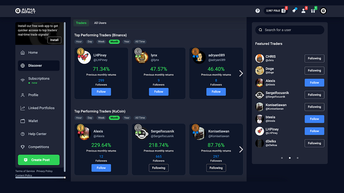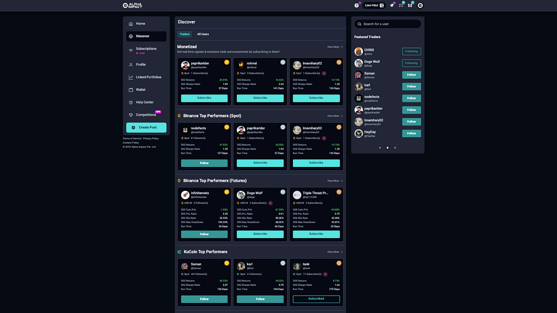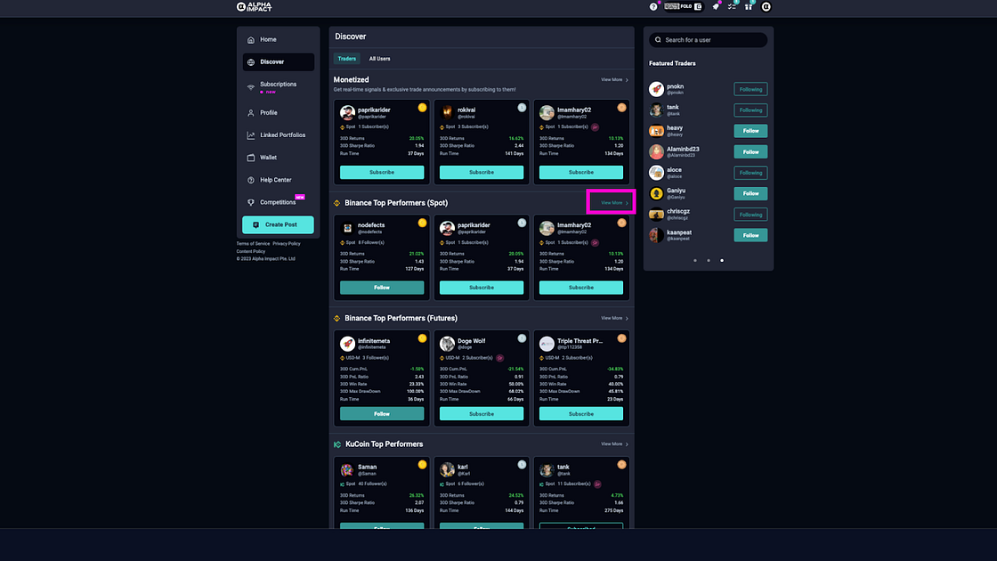 Previously, the Alpha Impact Discover Page featured only three segments: “Monetized Profiles,” “Top Performing Traders in Binance,” and “Top Performing Traders in Kucoin.”