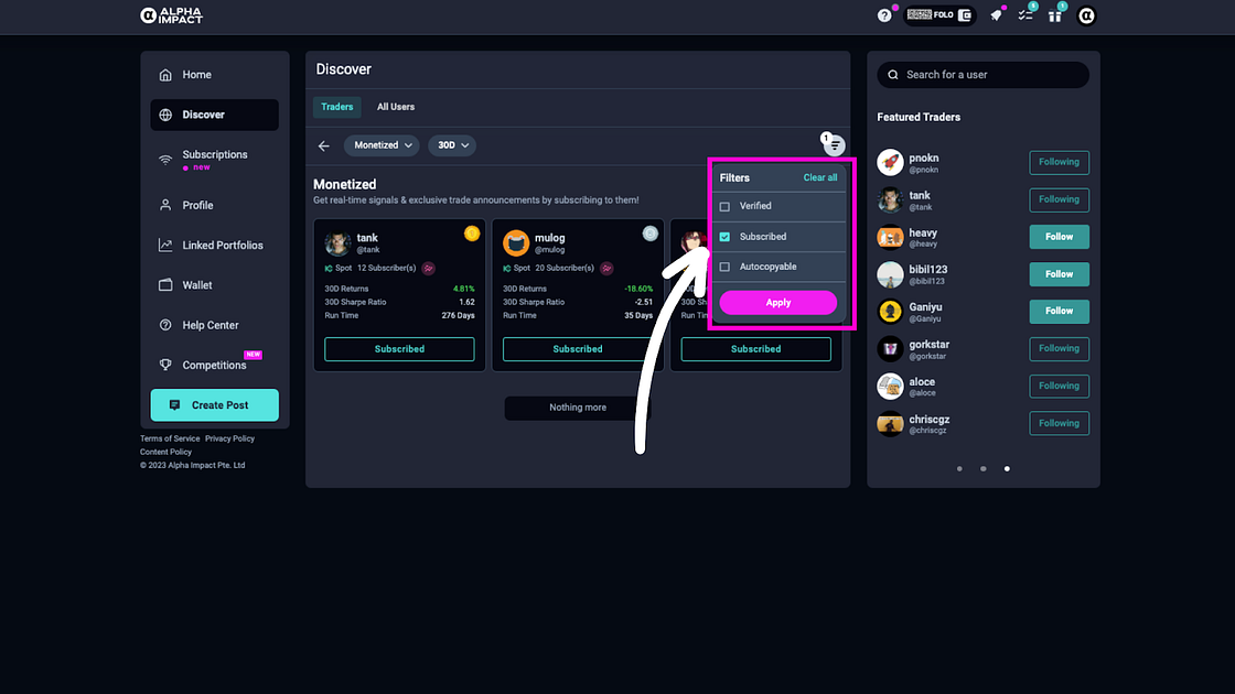 Experience the power of Alpha Impact’s revamped UI/UX on the Discover page, designed to provide you with a comprehensive overview of the diverse trading community and influential thought leaders in one glance or delve deeper into their strategies.